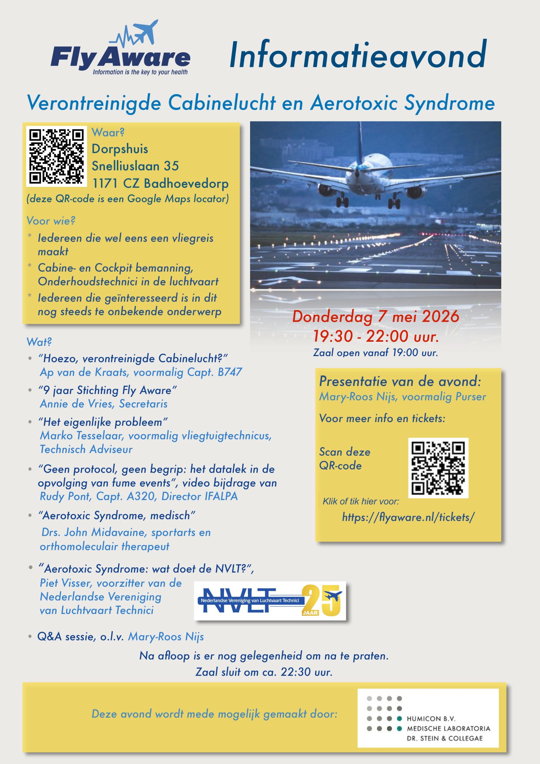 Informatieavond verontreinigde cabinelucht en aerotoxic syndrome 6 maart 2026 Algemeen, Nieuws Entree €12,50, klik hier voor tickets Voor vragen kun je contact opnemen met info@nvlt.org Share This Twitter Facebook LinkedIn E-mail vagevuur